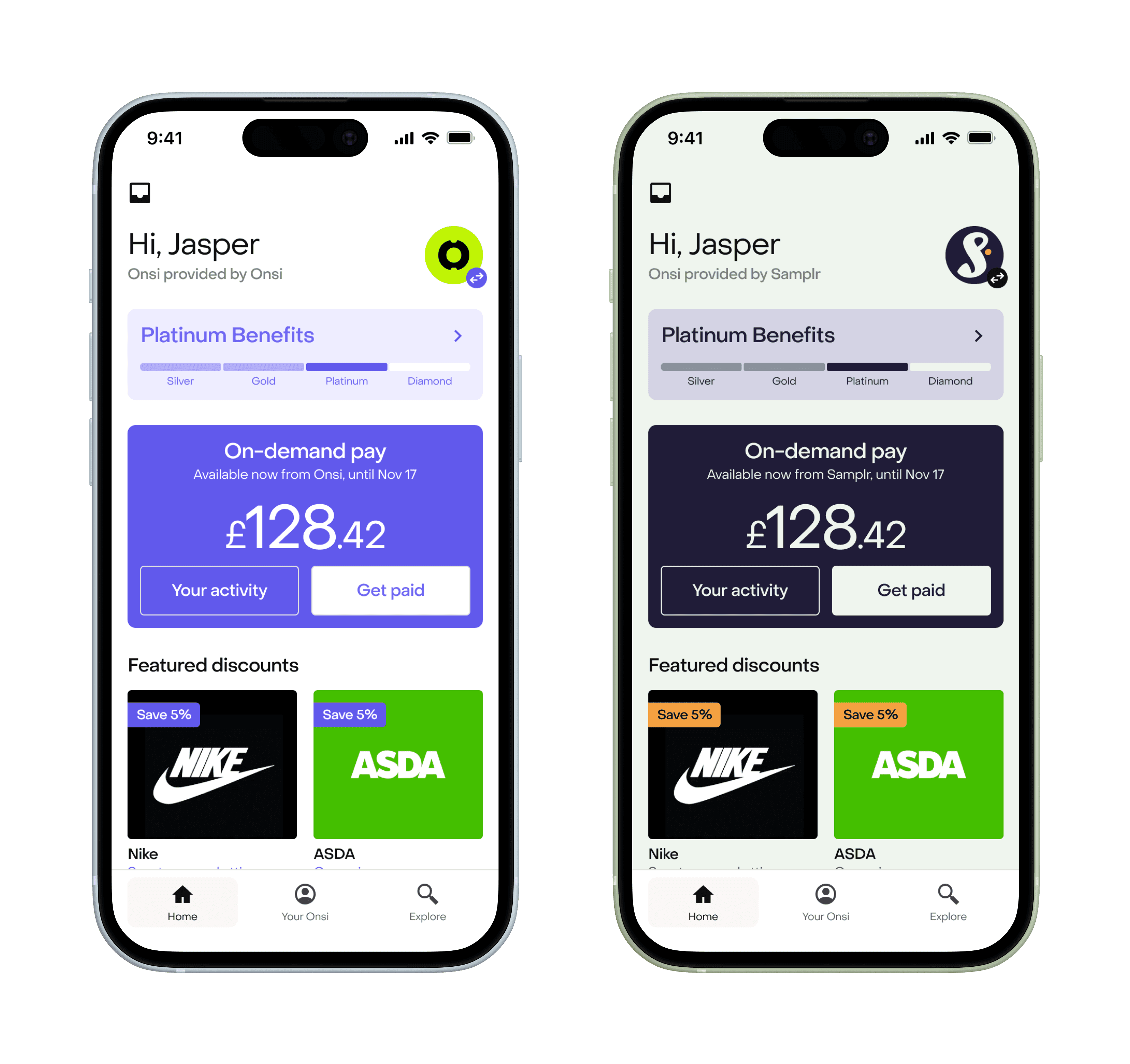 In the example below, we see an unbranded Onsi Member App followed by a fully themed version. Note that upon confirmation of launching this feature, the design team at Onsi are more than happy to take your design system and ensure it displays beautifully inside Onsi.